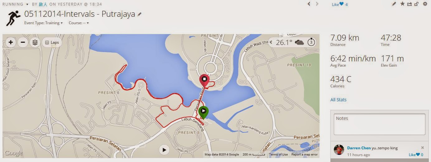 Chauky讲配速6,都不懂要不要信他好。。。哈哈,被他带过上车和烧车,有阴影了。一开始先来一个10分钟的热身,不过因为他在所以我跑得有点太快了,10分钟过后,我们就开始了5分钟快跑+1分钟休息的Interval;Chauky有说过这属于Tempo Cruise。Interval的快速应该属于5KM的快跑配速,然后休息时间也大概3分钟左右。